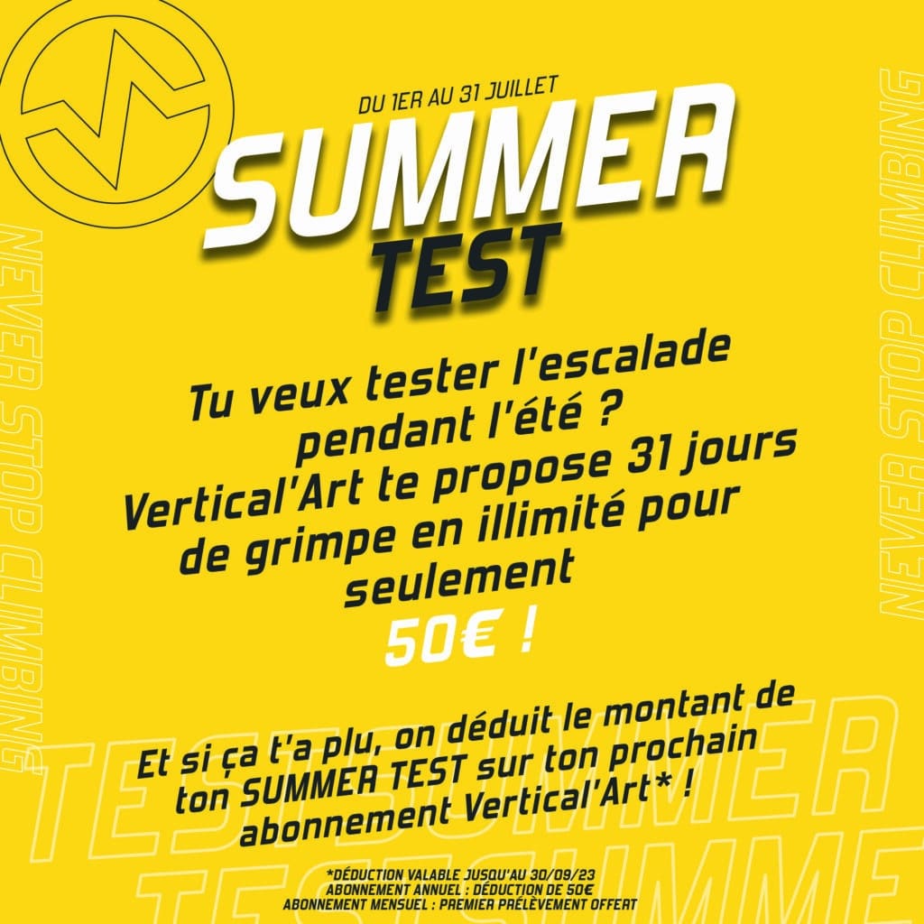 Grimpeurs, grimpeuses, voici le Summer Test, la nouveauté de l’été made in Vertical’Art pour découvrir l’escalade à prix réduit en juillet et août ! Le Summer Test, notre super pass de l’été, est une formule simple pour tous : 31 jours de grimpe à volonté pour seulement 50€.