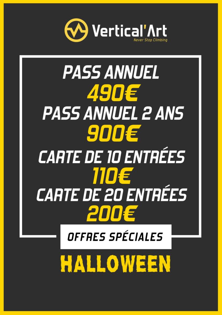 Vertical’Art Nantes met les bouchées doubles pour Halloween. Du samedi 21 au mardi 31 octobre, votre salle de bloc met en place sur son SHOP des formules spéciales « Abonnement 2 ans » et « Carte de 20 entrées », en plus d’offres sur l’abonnement annuel et la carte de 10 entrées :