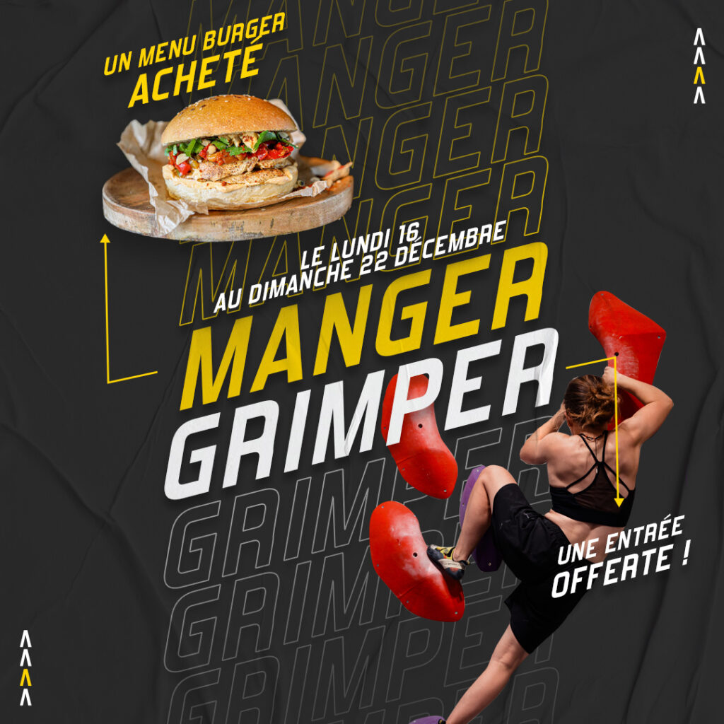 Du lundi 16 au dimanche 22 décembre, nous vous proposons une expérience unique : associer un repas à une séance d’escalade. Que vous soyez amateur de bonne cuisine ou passionné de grimpe, cette offre est faite pour vous !
